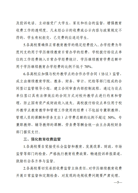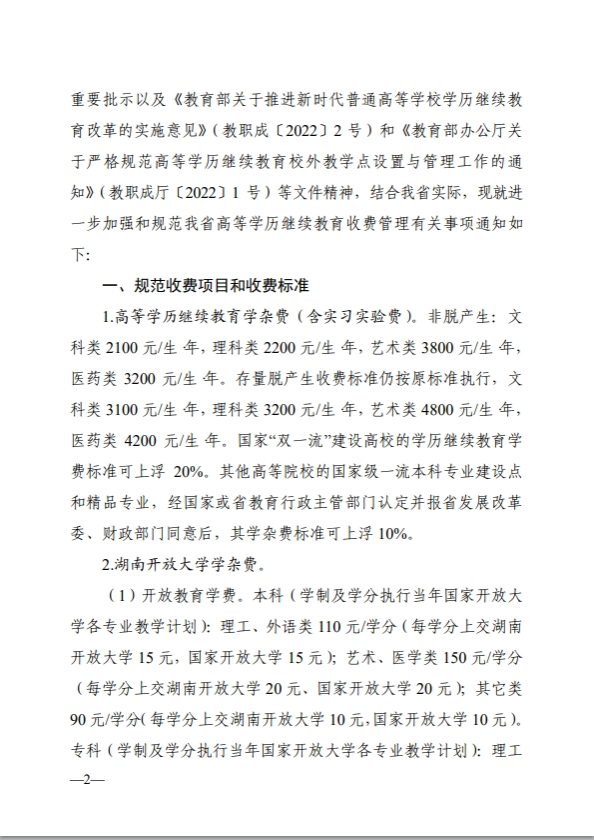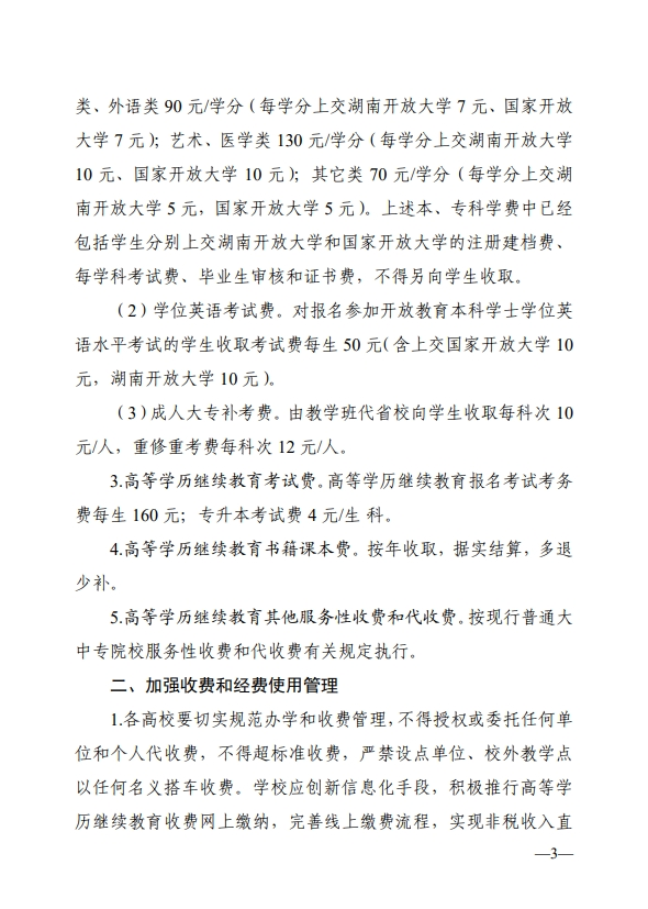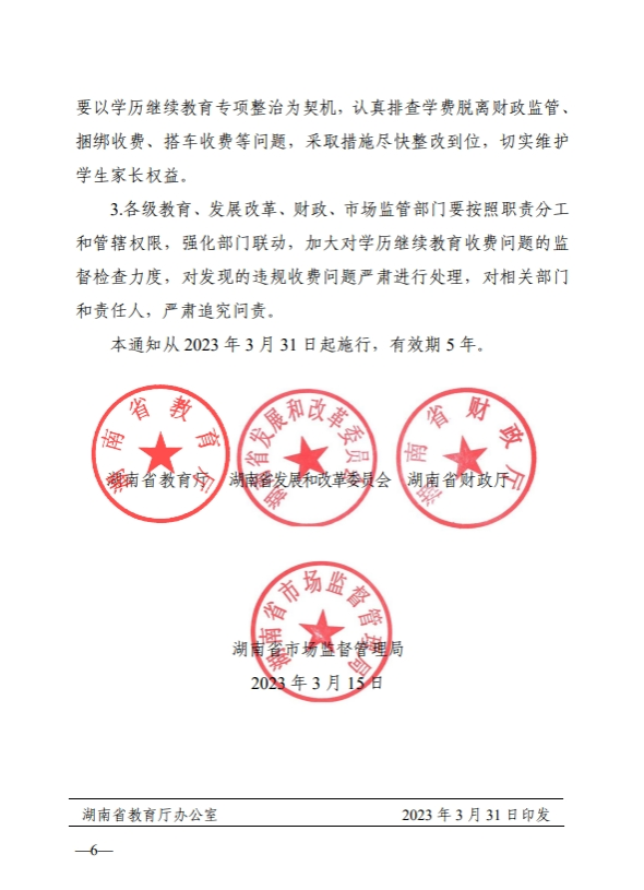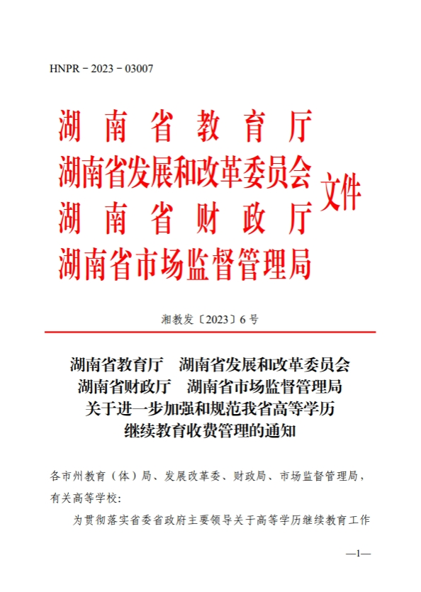 湘教发〔2023〕6号 湖南省教育厅 湖南省发展和改革委员会 湖南省财政厅 湖南省市场监督管理局关于进一步加强和规范我省高等学历继续教育收费管理的通知